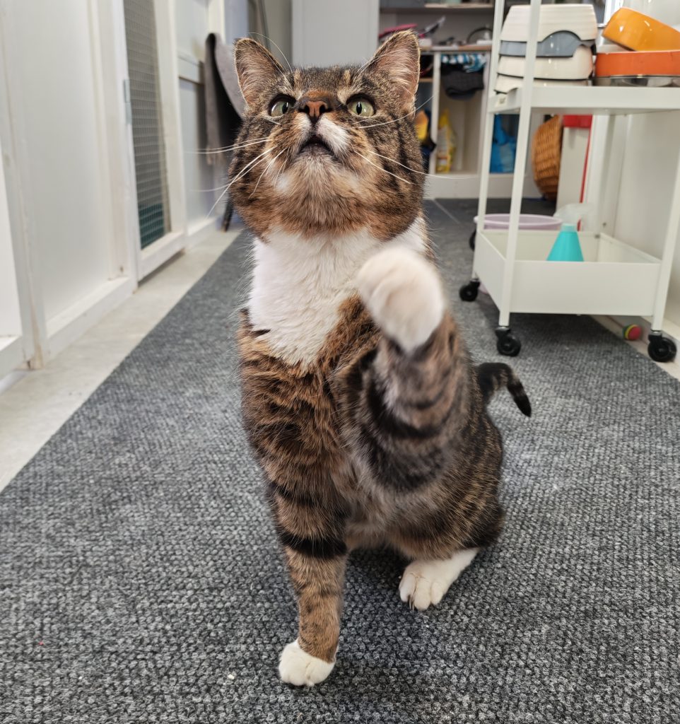 Oon kovasti ruuan perään, mutta niin oon myös rapsutusten ja silitysten perään. Oon oikeen lepposa kaveri, kova jutusteleen ja vaihtaan kuulumisia.